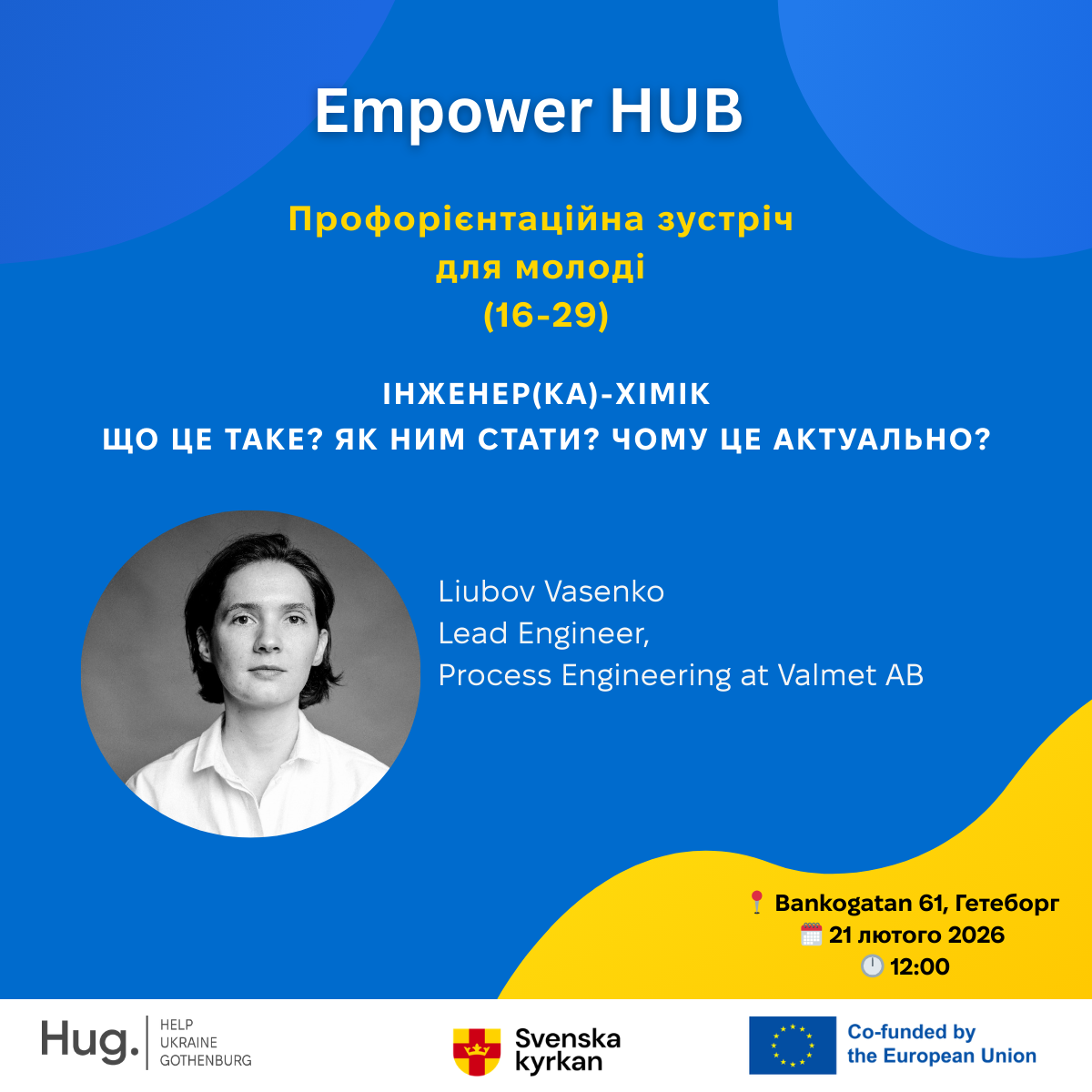 Vår talare – Liubov Vasenko, huvudingenjör inom processteknik på ValmetAB – kommer att dela med sig av både sin yrkeserfarenhet och sin personliga resa till ingenjörsyrket. Liubov är en stark och modern ukrainsk yrkesperson som målmedvetet bygger sin karriär i ett internationellt företag och arbetar med storskaliga industriprojekt.